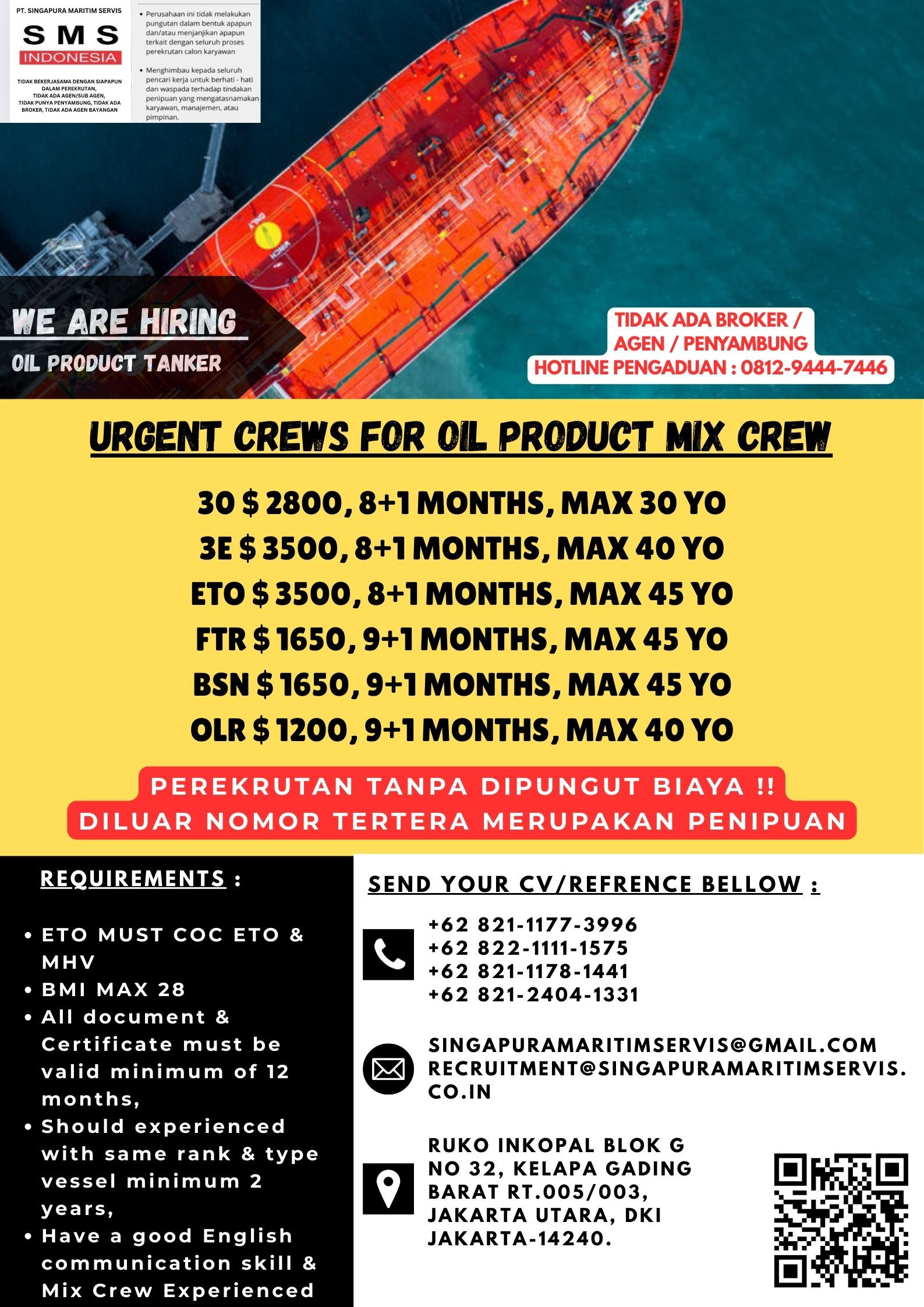 Email for CV : recruitment@singapuramaritimservis.co.in & singapuramaritimservis@gmail.com